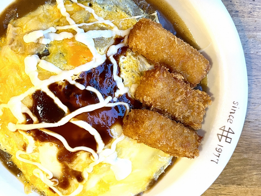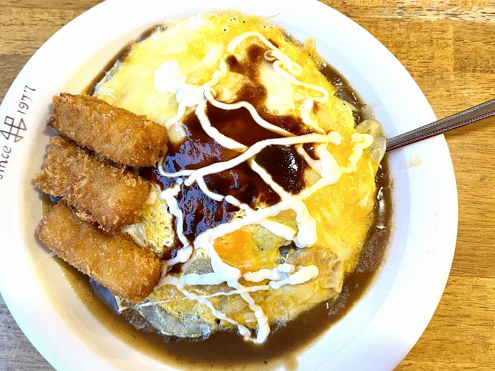 今回も大好きなやさたまコロッケカレーを注文。やさたまカレーのやさたまとは、野菜が入っている薄焼き卵のこと。やさたまは、カレーライスの上にのっていて、オリジナルソースと酸味が少ないマヨネーズがかかっています。かれー屋伊東の大人気メニューです。