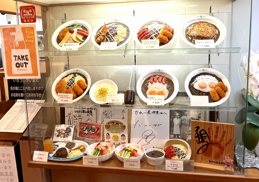 メニュー表には、やさたまがのっていないカツカレーやメンチカレー、ハンバーグカレーなどのほか、カツ、玉子焼き、ウインナー、ポテト、インゲン、梅干しがのった幕の内カレーなんていうのもあります。見ているだけで、楽しいですね。