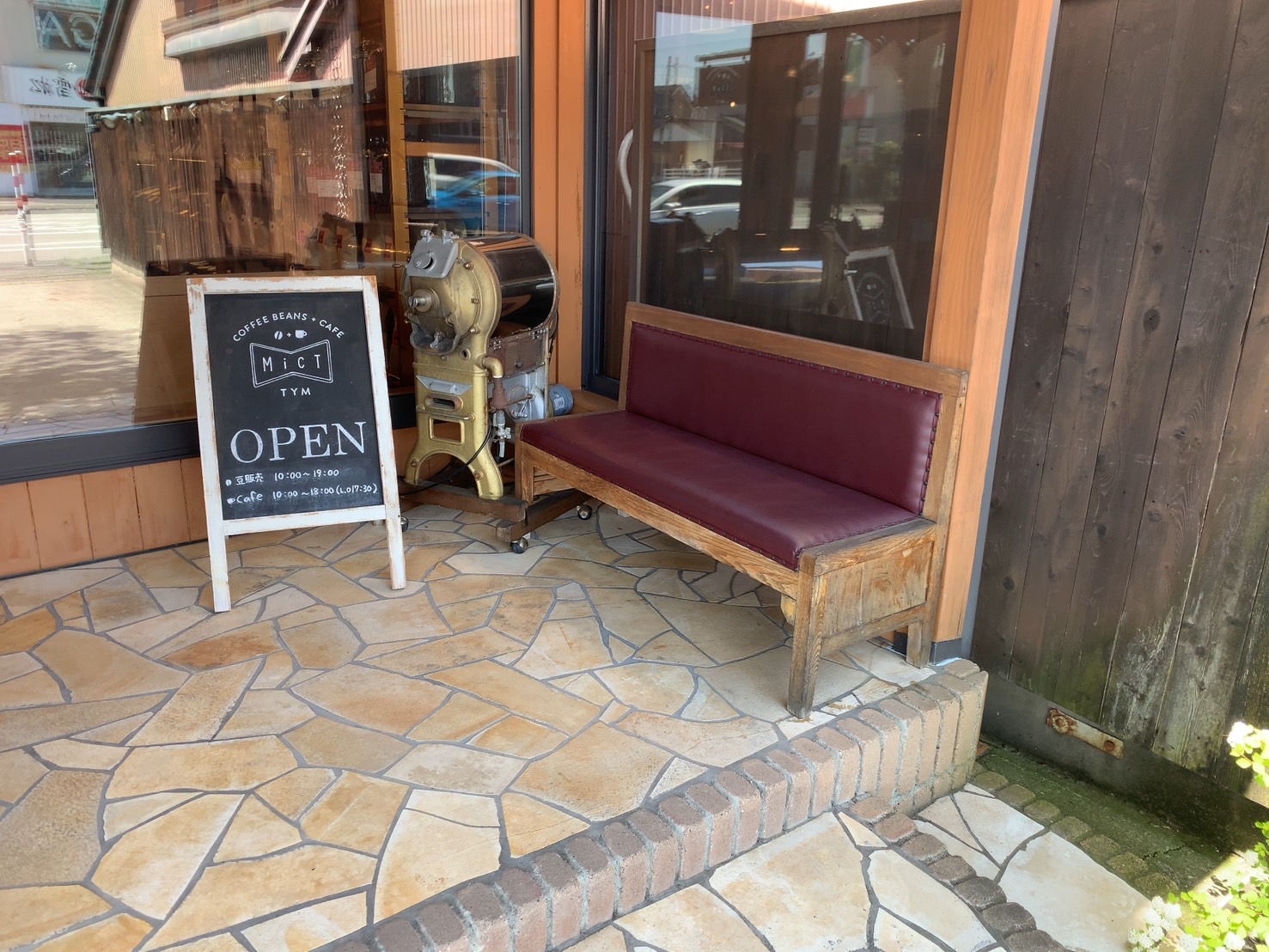 カフェミクトに着くと出入り口の前に数名座れる椅子と、1日の予定が書いてある黒板が置いてありました。