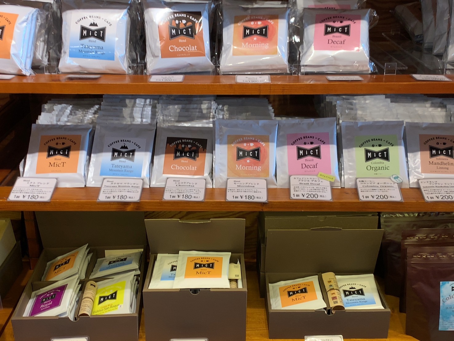 ドリップ珈琲も充実していまして、1袋150円から200円程度で高品質のコーヒーを自宅で楽しむことができますのでおすすめの商品になります。モーニングブレンド、コロンビアオーガニックなど他の店では購入できないミクト独自のドリップコーヒーが販売されています。