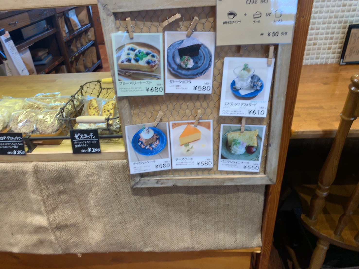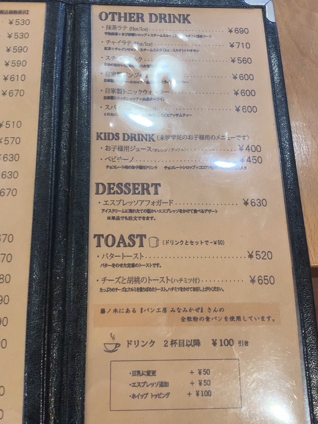 トーストメニューもありまして、バタートーストとチーズと胡桃のトースト(ハチミツ付)があります。ドリンクとセットで注文しますと50円安くなりますので、セットで注文するのをおすすめします。