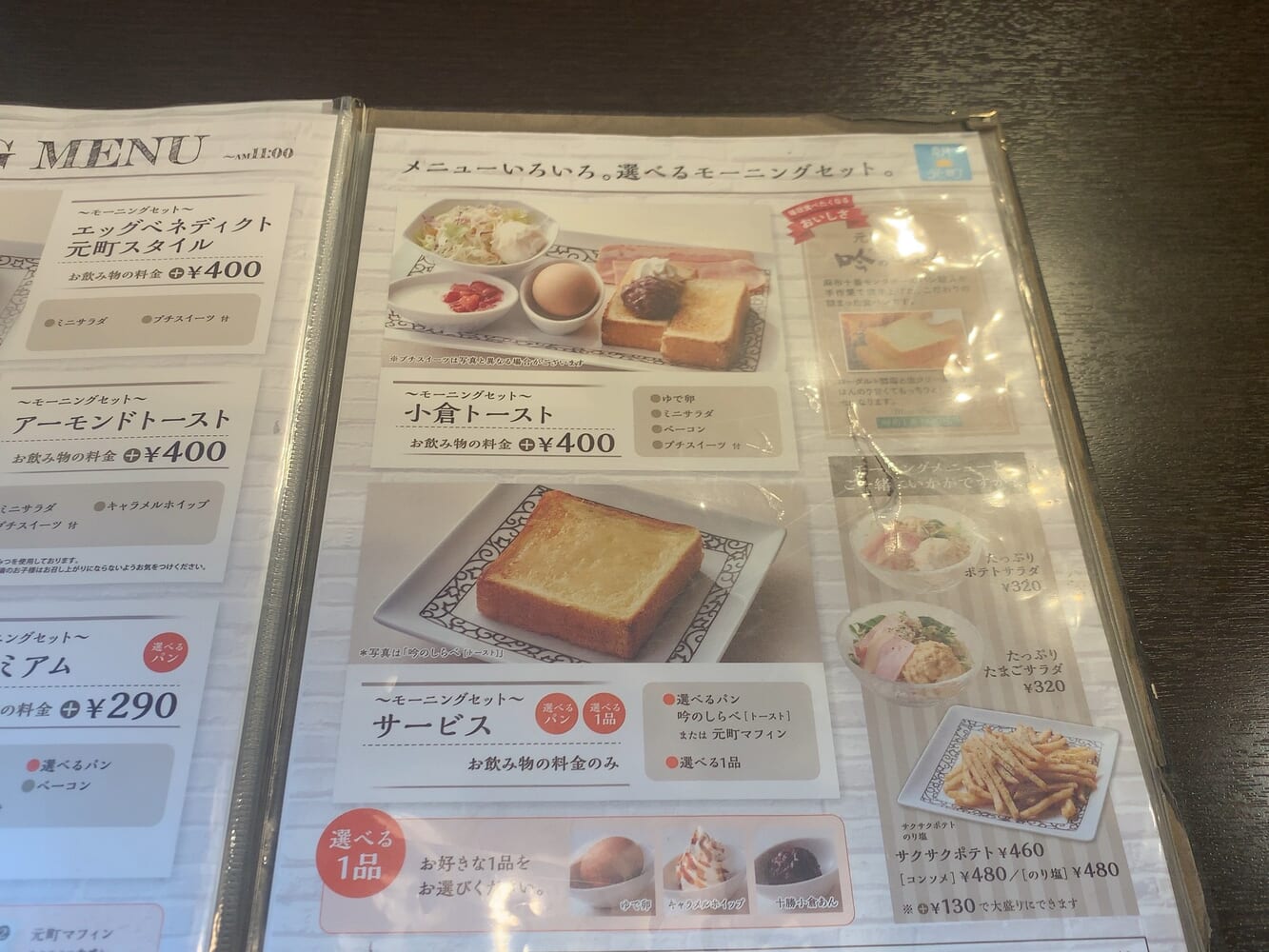 元町珈琲さんのメニューには朝限定のモーニングセットがあり、小倉トーストのセットや、飲み物の料金だけでトースト(十勝小倉あん、ゆで卵、キャラメルホイップの三つの中から選べる)も食べられるサービスがあります。