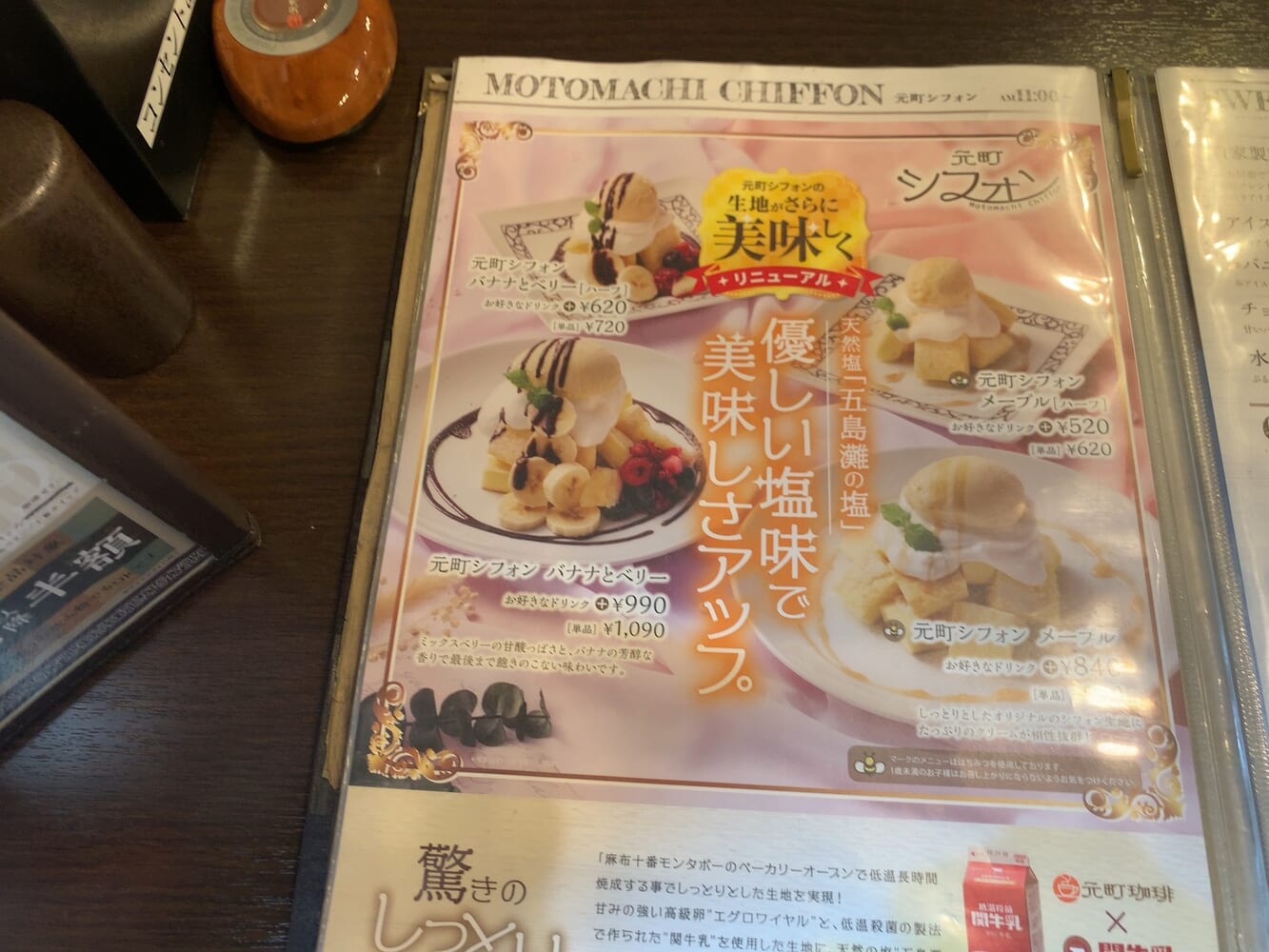 デザートメニューも充実していて、元町シフォンバナナとベリーや、元町シフォンメープルがあります。どれもおいしい味わいがあり、女性におすすめの甘味が感じられるものになっていて、食後のデザートにぴったりの一品になってます。