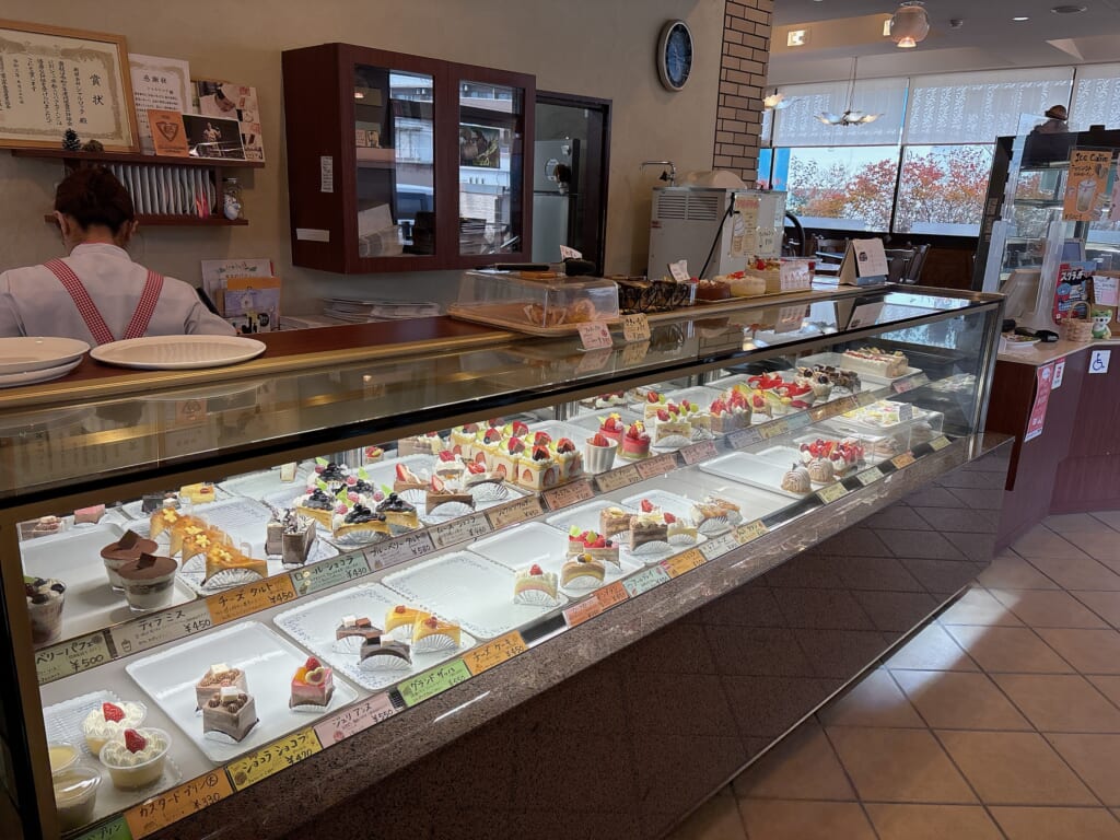 お店にさっそく入ってみると、左側には大きなケーキの並んだショーケースや洋菓子が並んでいて、右側には喫茶スペースがあります。持ち帰りだけではなく、ケーキやパフェやソフトクリームをこちらで食べることができます!