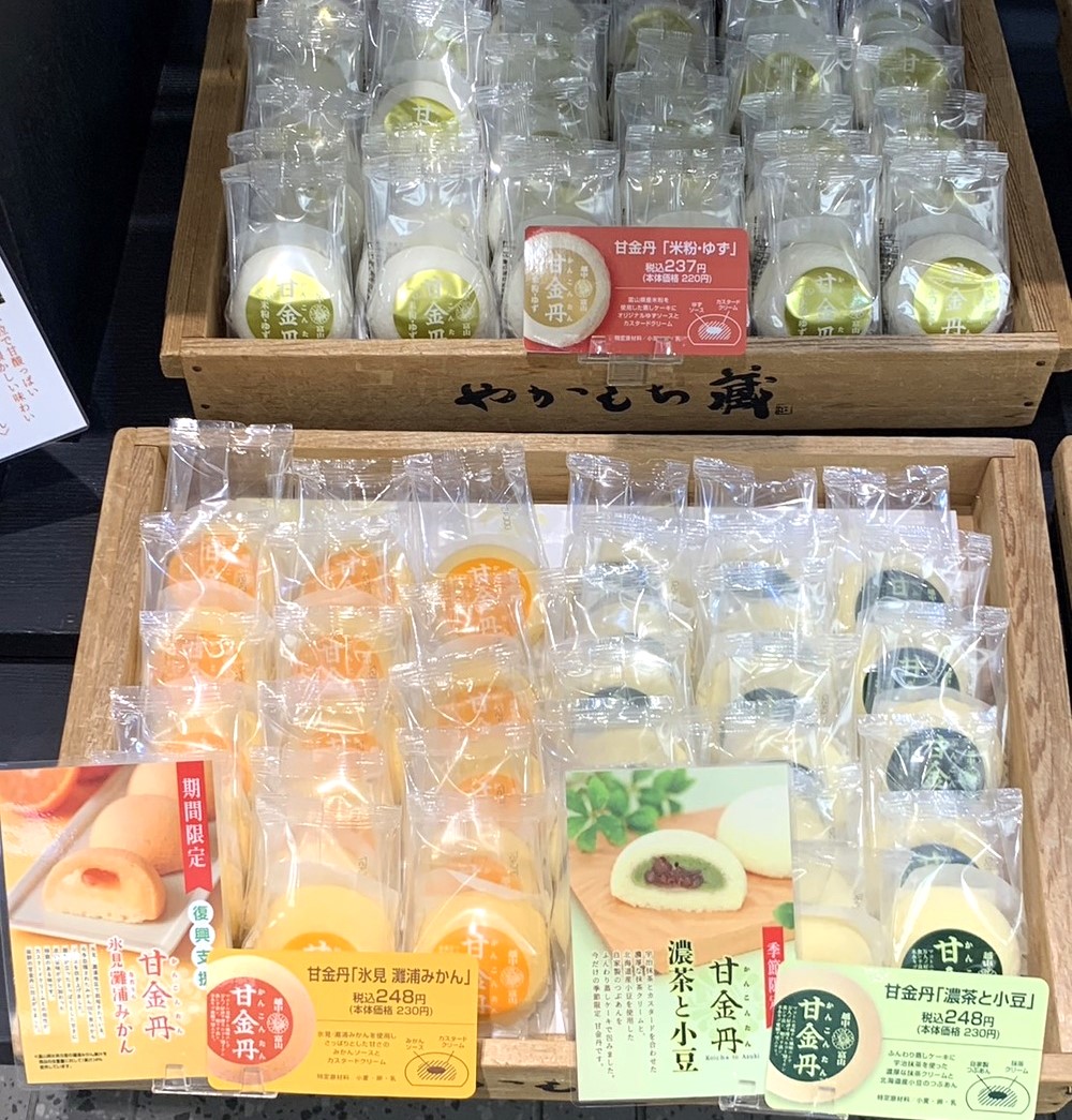 甘金丹はプレーン味の他にも、苺味、ピスターチオ味、米粉・ゆず味、氷見灘浦みかん味、濃茶と小豆があります!どれもおいしそうです。