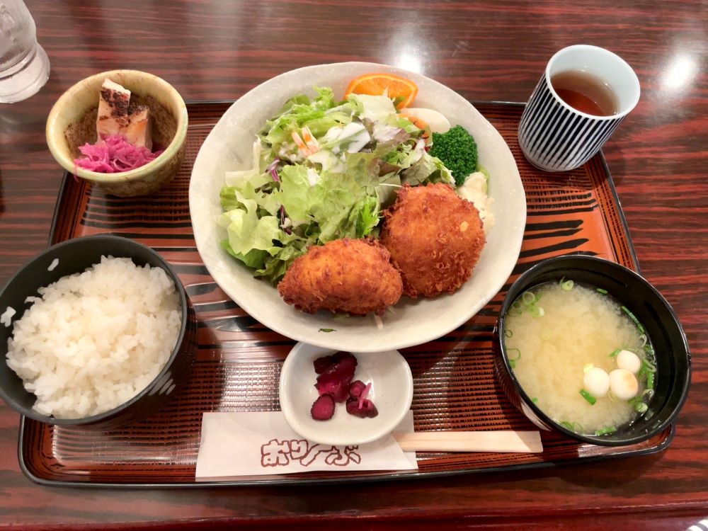 コロンと揚がった丸くてぶ厚いカニクリームコロッケがたっぷりのサラダの上にのっていて、味噌汁、小鉢、お漬物がセットになっています。