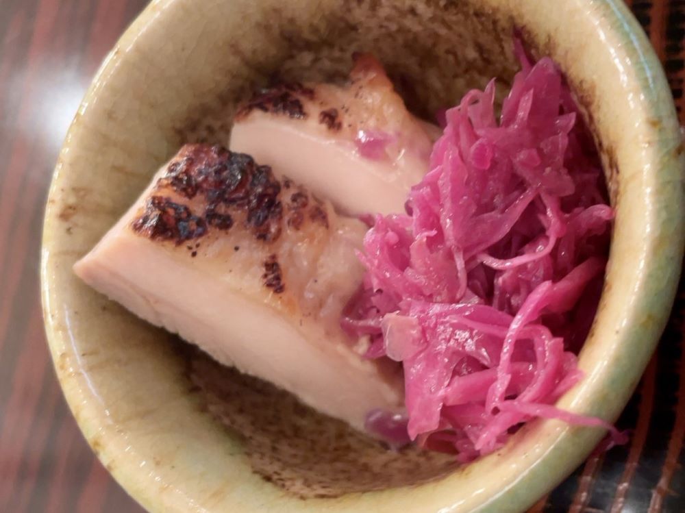 この日はキャベツのお漬物と、鶏むね肉が塩麹でしっとり柔らかに味付けされたものでした。
