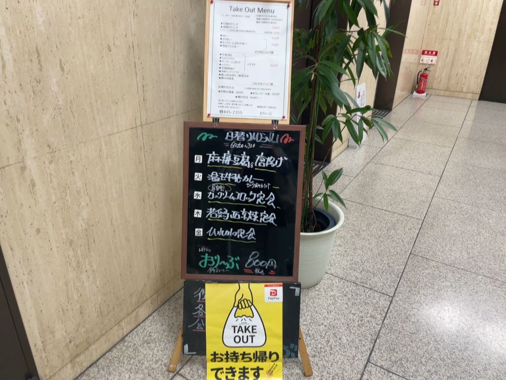 お目当て「おりーぶ」さんの今週の日替わりランチのラインナップと、テイクアウト用のメニュー表です。