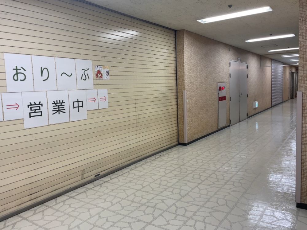 エレベーター横の階段で地下へ向かうと、閉まりきったシャッターに「おり~ぶ営業中」の張り紙が。