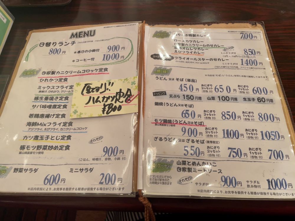 メニューを開くと、さっき見た日替わりランチに加えて常設の定食、カレー、うどん、スパゲッティ…おいしそうなものが勢ぞろいしています。