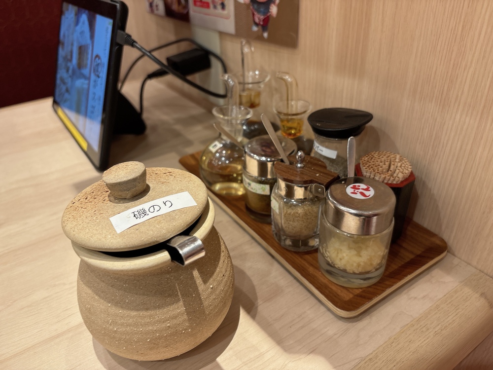 お酢や磯のり、にんにく、コショウ、ラー油などたくさんのトッピングを自由にかけることができるので味変にもピッタリです。