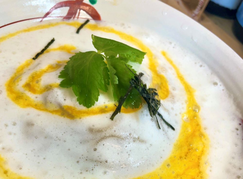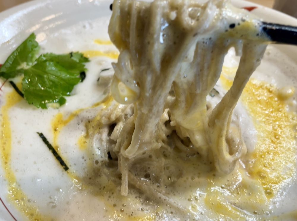 細めの麺にフワフワのメレンゲがしっかり絡み、卵黄のコクがアクセントになって奥深い味わいです…おいしい…!!