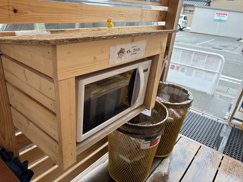 また、電子レンジが置いてあるので食べるのに時間がかかり冷めてしまった場合など温め直して食べることができます。寒い日にはストーブも用意されているみたいです。
