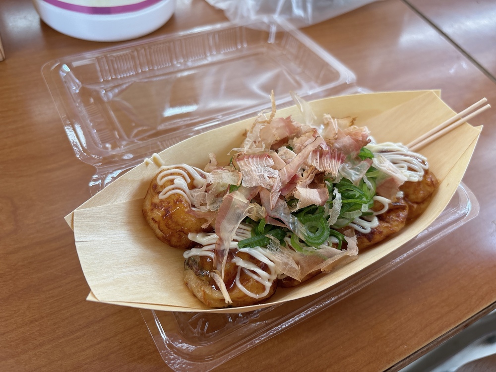 シャキシャキのネギと香りのよいかつおぶしがふわふわのたこ焼きをより引き立てます。他の味のたこ焼きも気になるおいしさでした。