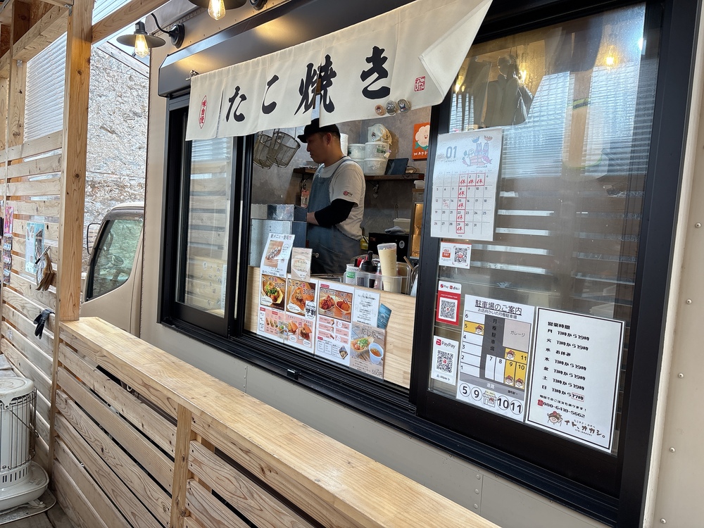 ベンチに座ってたこ焼きが焼きあがるのを待てるので、お年寄りや子どももうれしいですね。