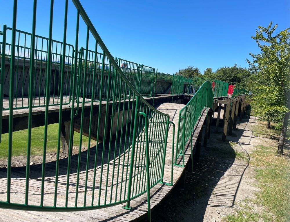 狭いトンネルや手すり付きの一本橋、うねりのある木製の床やロープネットなど、オリジナリティのある遊具がおよそ100mほどに渡って続いています。