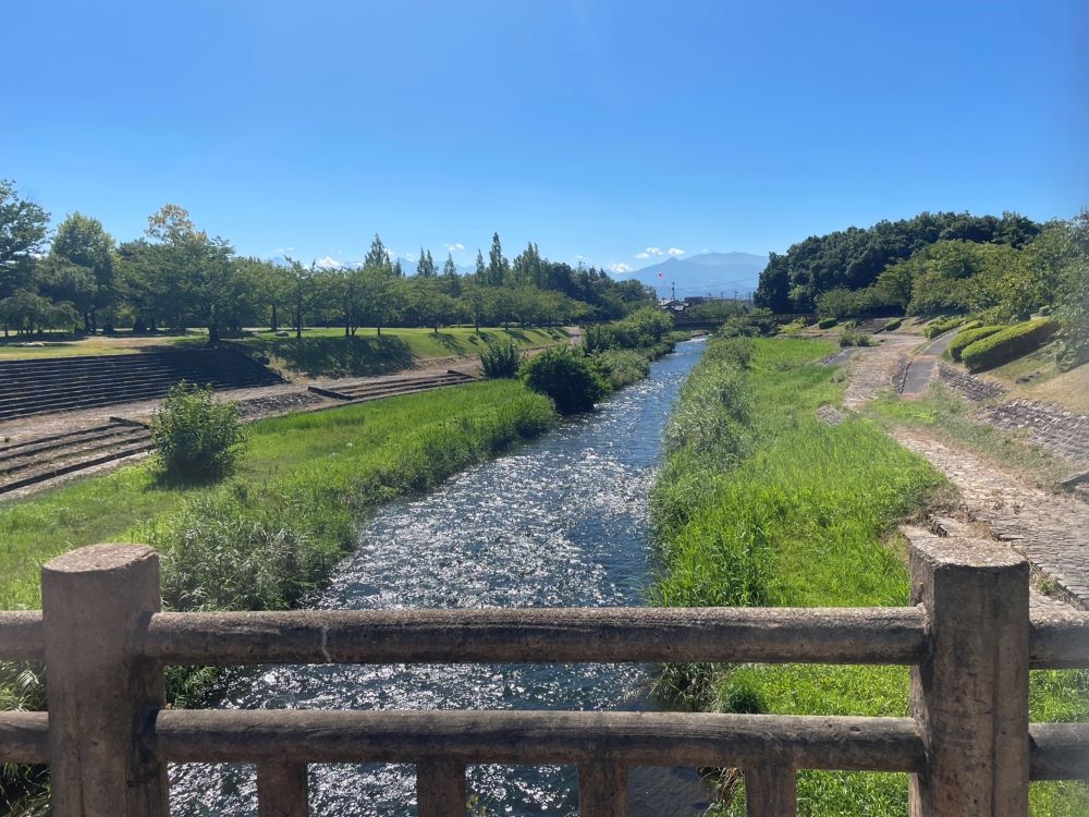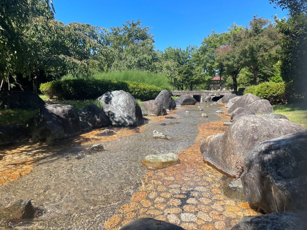 公園を分かつように赤江川がサラサラと流れ、橋を渡るだけで涼やかな気分に。