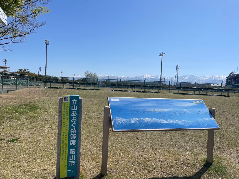 中央付近の広場に出ると、澄み渡る青空に凛々しい立山連峰のシルエットが!