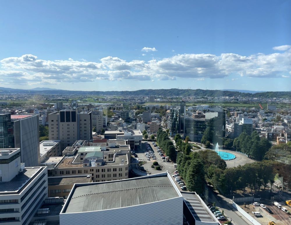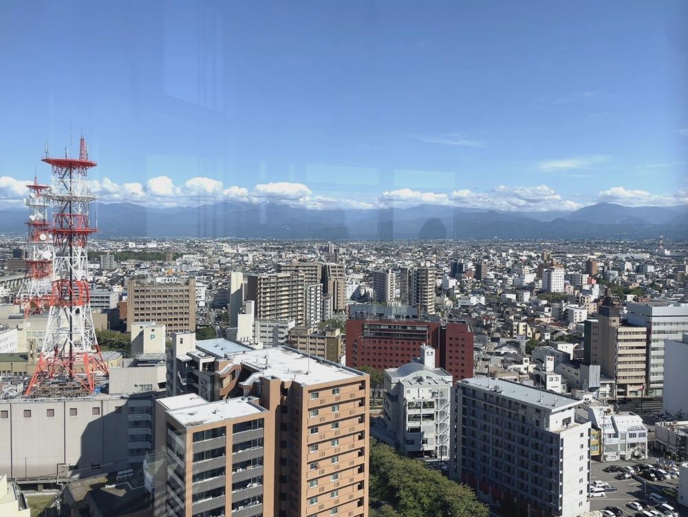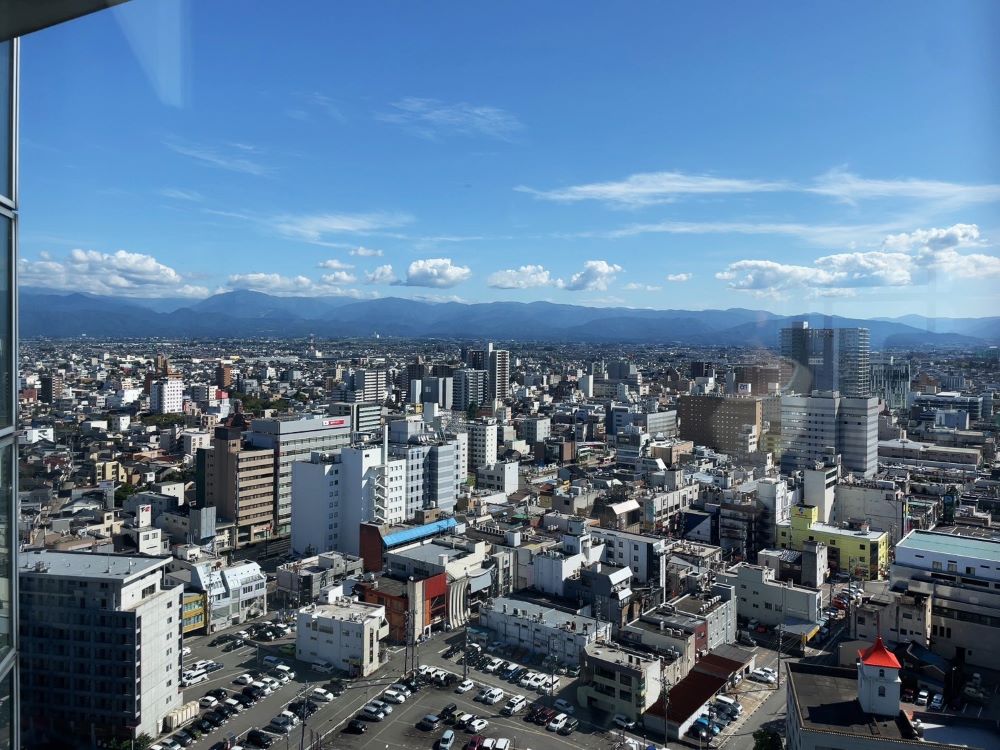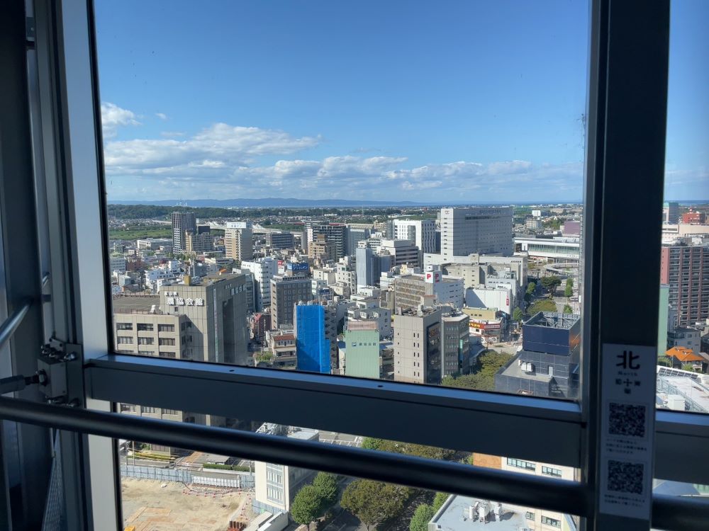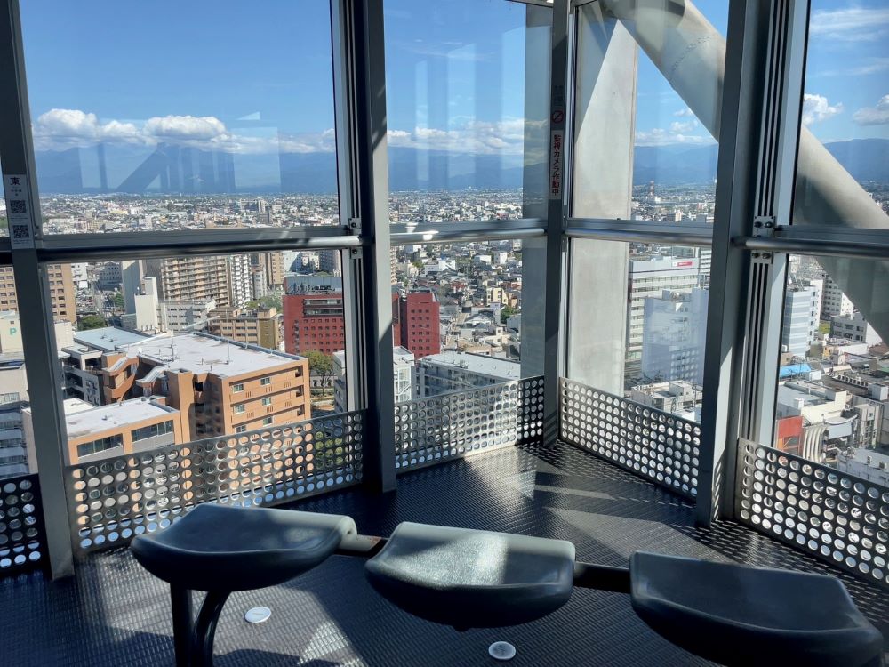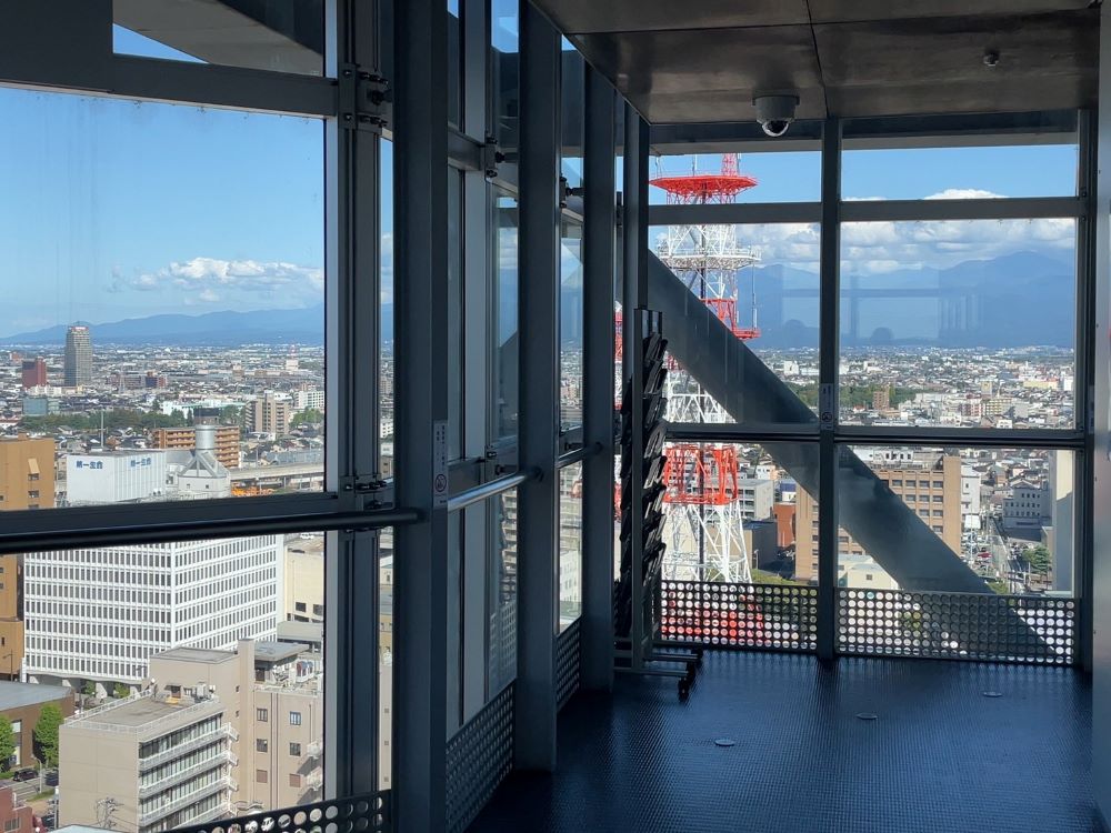 扉が開いた瞬間、爽やかな青色と富山市の全景が目の前に広がります。