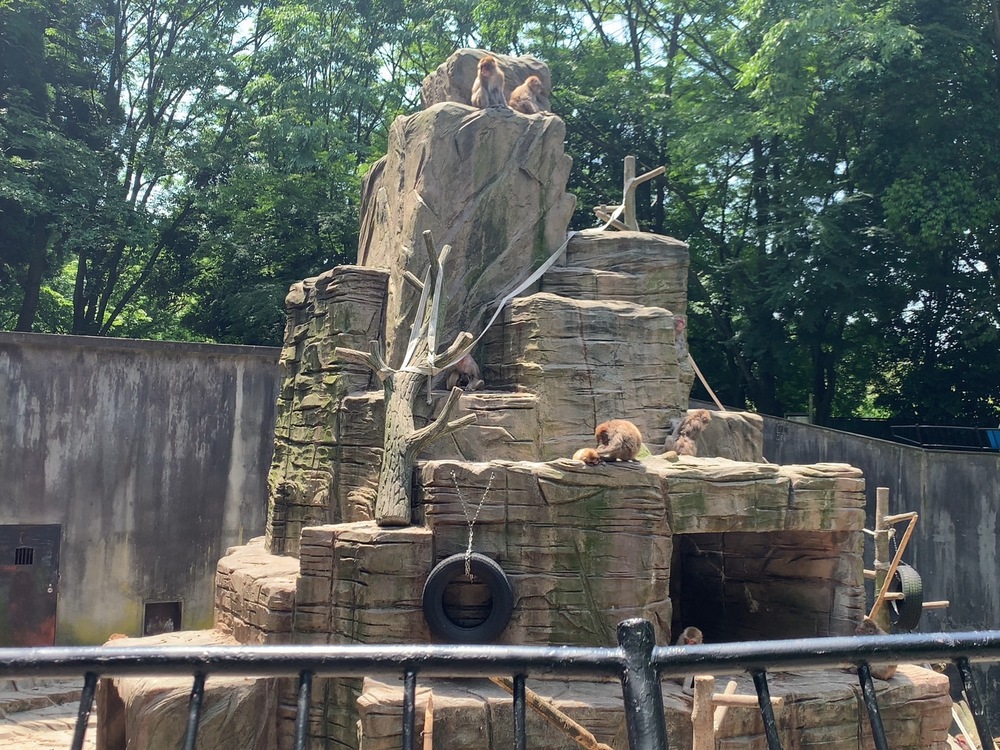 上から下まで全長30~40mほどの高い塔のエリアにいるのは、ファミリーパークの中でも多くの数がいるホンドザルです。