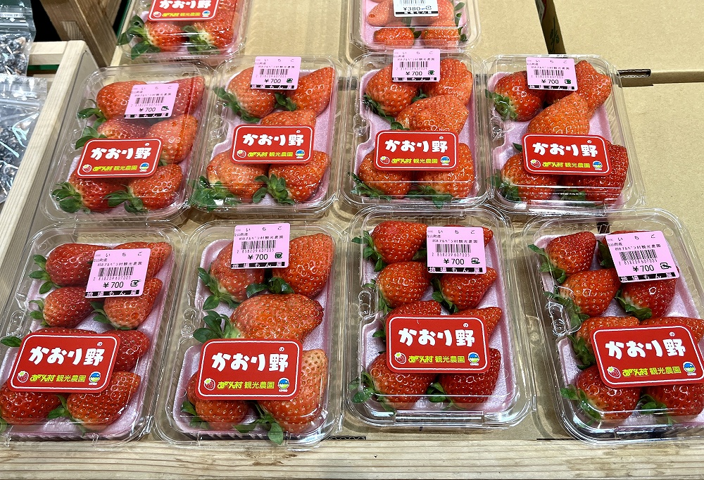 冬から春先のいちごシーズンには、かおり野や紅ほっぺが並びます。どれもハリや艶があり、光沢があるものばかり。