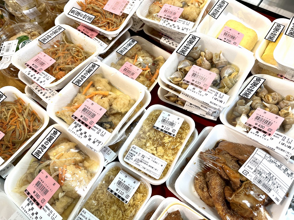 たくさんの種類が並ぶ総菜やお弁当は、昼ごはんにも夜ごはんにも重宝しそう。卵焼きや煮豆、きんぴらといった、定番の総菜は、作ろうと思うと意外に手間がかかるもの。少人数の家庭にぴったりな量がうれしいですね。