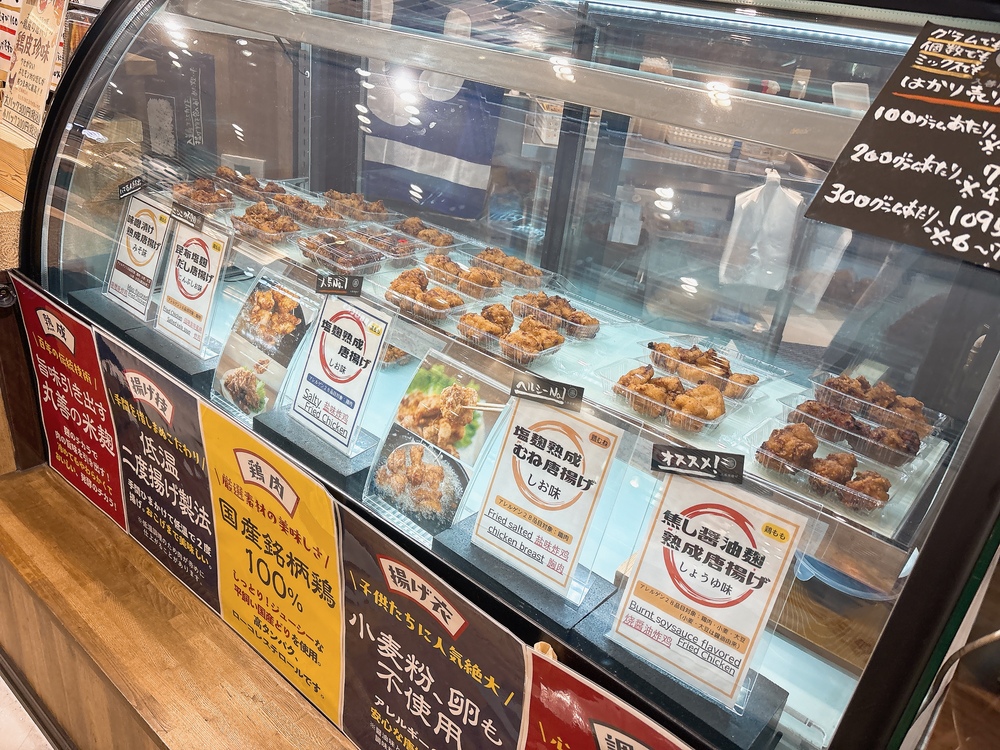 店先のガラスケースには、種類豊富な唐揚げがずらりと並び、見た目から食欲をそそりますね!