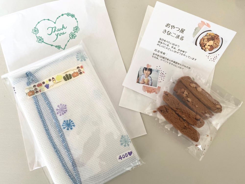 迷った末、選んだのはハンドメイドの雑貨屋さんで一目惚れしたふきんと、身体にやさしいお菓子を作る「おやつ屋きなこまる」さんのビスコッティ。