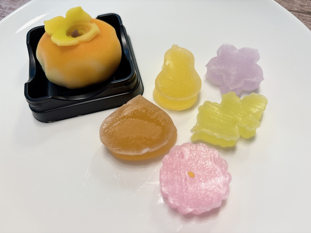 秋の風情を映し出した上生菓子がたくさんあり、名月や紅葉、柿など、どれも美しくて選ぶのに迷ってしまうほどでした。